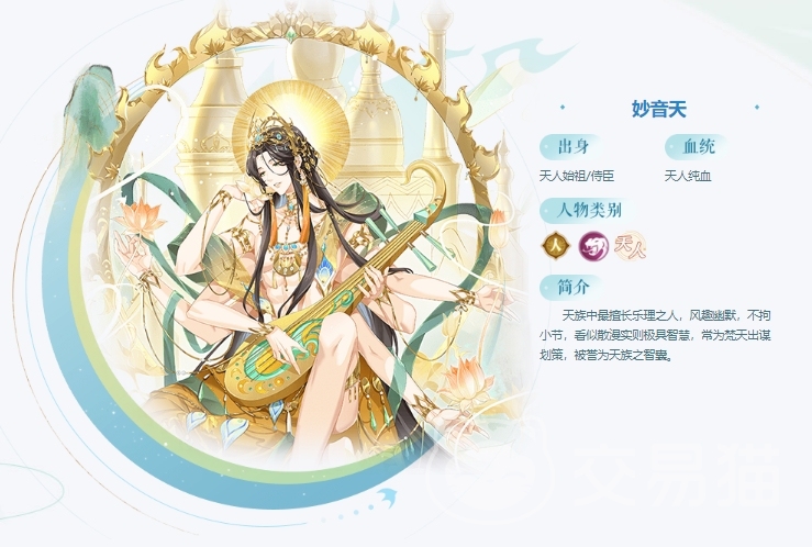 妙音天:这个角色实际在外观的氛围上面其实跟梵天走的是同一个系列,大家一眼就可以看出来是国风敦煌的画风,这个角色也是天人血统的侍臣,在游戏中因为设定是非常擅长音律,所以在外观上面也是拿着一把琵琶,六只手除了弹琵琶之外还会手拿莲花,搭配整体金黄的色调看起来是很昂贵的样子。