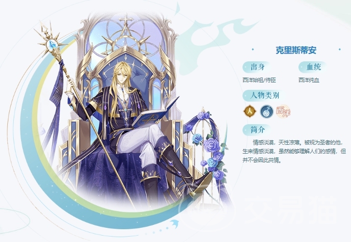 克里斯蒂安:是一个有着西洋血统的侍臣,外观上面大家也可以轻易的看出来,整体是用的蓝紫色作为装饰,直接坐在了皇位上面,手上拿着权杖,身上穿着鬼族服装,一头金黄的长发搭配周围的紫罗兰装饰看起来就是西式风格的人物设定。
