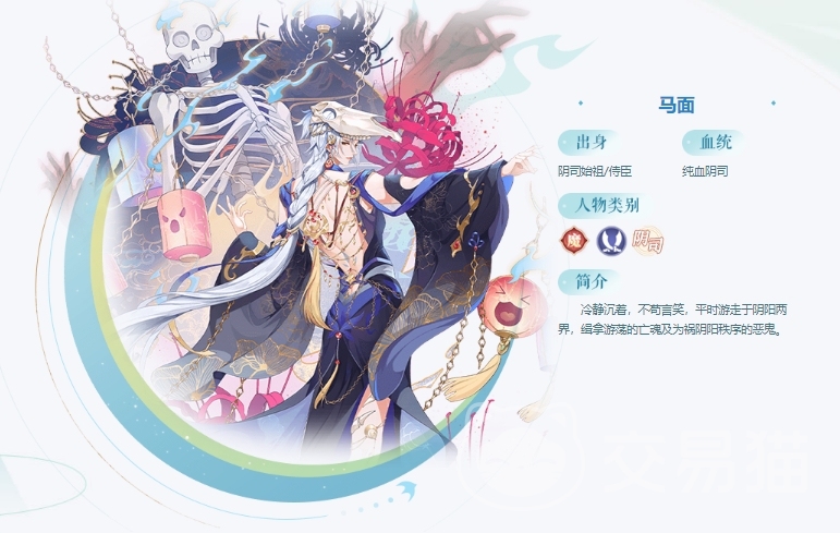 马面:这个角色也是侍臣,在外形上面看起来是比较具有危险性的,因为是阴司的血统,所以在装饰上面采用了部分的曼珠沙华来作为背景,在人物外观设定上面银白的长发编成了马尾,发尾还系着一个金色的装饰,搭配蓝色的长跑以及暗金的花纹,看起来高贵十足。