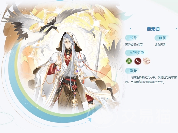 燕无归:看起来是一个很正派很清高的角色,在血统上面是纯血的词牌,在游戏中也是一个情绪正面的角色,身上穿的是世家子弟的长袍,头上的兜帽带来神秘感,额上还有珠串作为抹额,背后的背景上面也使用了白鹤来印证这个角色的人设。
