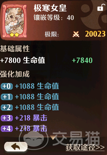 极寒女皇:它又是一张攻防俱佳的红卡,隶属于万灵卡组,这也是游戏前中期比较容易获得的一种卡组,该卡牌极限战力高达20023,而且这个战力并不是虚高,因为它给的属性非常全面,基础属性加前三级强化就给了一万+的血量,而且这些血量是可以直接作用于PVP和副本两种模式的,然后三级以上提供的则都是暴击与无视防御的强化,这些强化不仅让角色的输出上限得以提升,而且也切实增加了打肉能力。