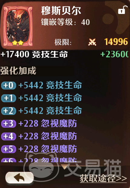 穆斯贝尔:该卡牌的获取门槛较高,不过也正因如此它对于玩家的提升非常明显,作为混沌系列的一员,这个卡牌的基础属性就有一万七+的生命,而且它加的生命值是作用于竞技场的,也就是在对抗其他玩家的时候你能够有更高的坦度,而且通过强化它还能再获取三次5442的竞技生命,配合后续忽视魔防和防御的能力,对上任何类型的对手,你的输出能力都不会被限制,如此攻防一体的加成也使得它成为后期PVP玩家的绝对头牌。