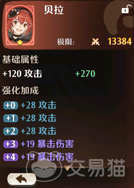 贝拉:它是一张纯输出的卡牌,玩起来非常的暴力,而且因为隶属于宸光卡组,所以游戏前中期也仍然有不小机会获取,基础属性就给了120的攻击,和前面的诺顿相比虽然略显不足,但她的培养潜力还是非常高的,后续经过多次强化还能再次提供额外的攻击,配合+3以后的暴击伤害,你角色的爆发将会进一步提升,当然,也不用担心暴击不触发,不少物理职业都自带暴击加成,而且这个贝拉卡牌培养满之后也是可以提供一定暴击率的。