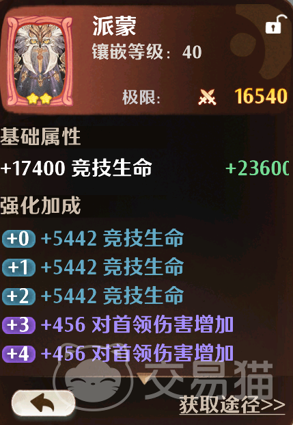 派蒙:这个也是混沌牌组中的红卡,它提供的竞技生命加成和穆斯贝尔是完全一样的,不过它除了能打PVP以外,在刷本层面也是一把好手,因为后续可以提供多次对首领伤害的提升,所以组队刷本的时候只要带上它那么就能显著加快攻克boss的速度,同时该卡牌在强化达到一定程度后还可以获得额外的魔法恢复,算是对技能的施放上限和角色的整体续航提供了增强。
