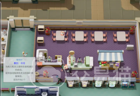 在这个游戏中,咖啡厅是比较重要的一个存在,因为每次饮用咖啡可以提升病人的幸福度,这样对于病情的好转和权愈可以带来很大的帮助作用,并且咖啡厅也不单单是让玩家引用咖啡的一个地方,在这里可可以靠墙摆上咖啡机,糖果机,并且在旁边设置上水池和洗手液,有了这些基础的设施之后,玩家就可以有更加良好的就诊体验。