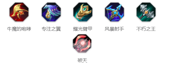 如果你是纯输出迷的话,那么可以考虑一下选择第3组出装,就是将“牛魔的咆哮、专注之翼、耀光臂甲、风暴射手、不朽之王、破天”进行整体的组合完成出装搭配。