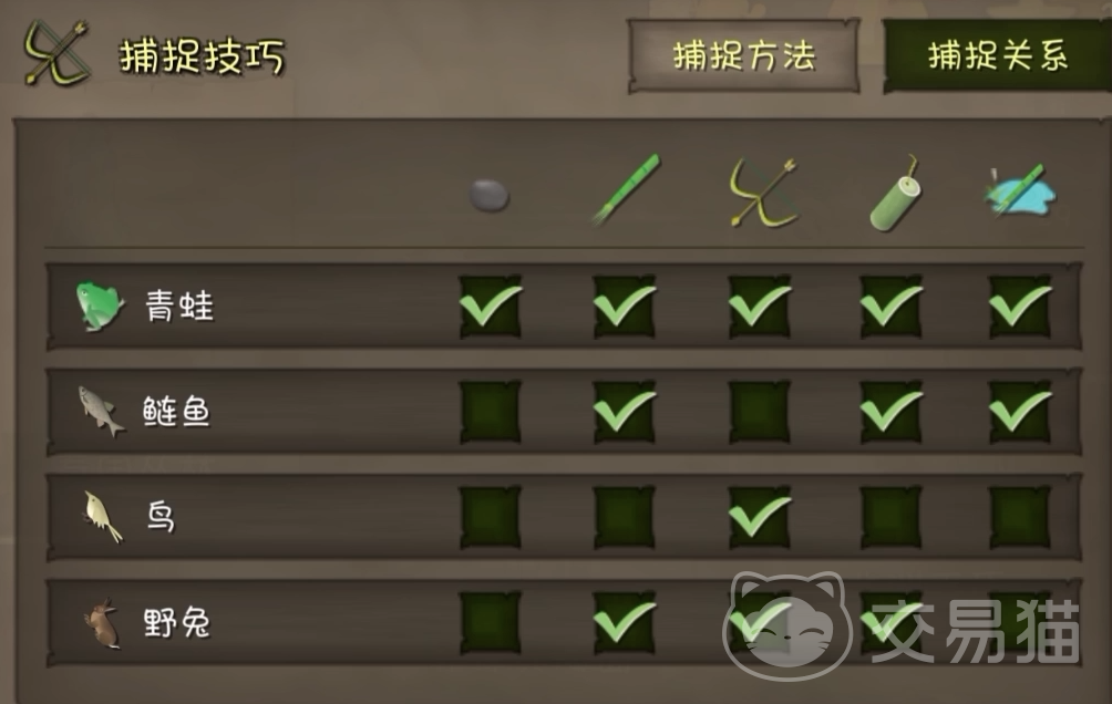 接下来的鸟,玩家们只可以使用弓箭一种方法能对其进行捕捉,这种方法很考验玩家们的技术,捕鸟也是获取最少的一种食材。最后的野兔想要捕捉的的话需要叉子,弓箭或者是捕兽笼。玩家们如果在中期发现兔子窝的话,可以进行在兔子窝这里进行定点捕捉,这样效率会高很多。