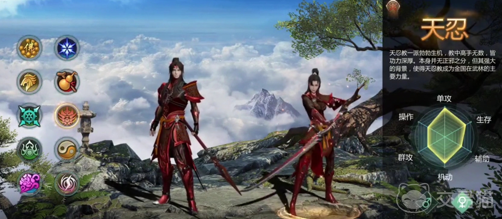主要分为战天忍和魔天忍,其中战天人为我们的外功近战系职业,属性方面主点一个力量,其枪法近身作战能够穿透敌人,并且还会根据一定的伤害比例来恢复自身的生命和内力,加上高稀有装备的加持,往往能做到以一敌多。而魔天忍则是内功远程系职业,强大的火系技能附带灼烧伤害,远程输出手段很不错,无论是打本刷怪都是极强的输出选择。