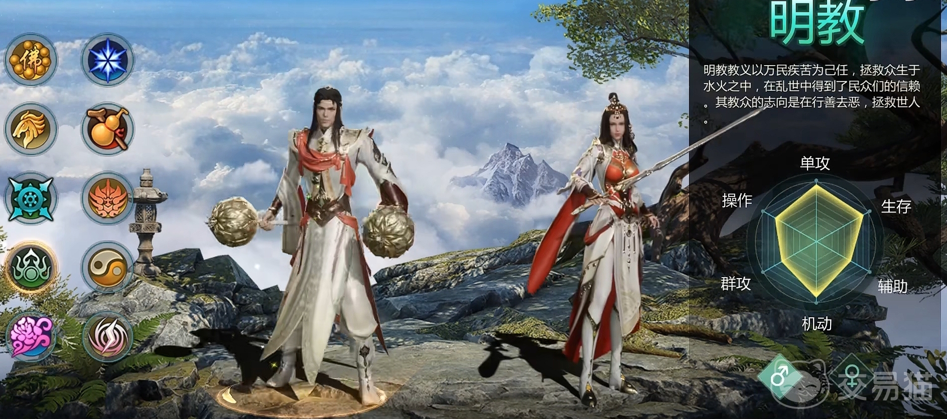 明教作为以万民疾苦为己任,拯救苍生为主要目的的正派职业,在乱世当中,受到了大量民众们的信赖和欢迎,其门派的本身志向在于行善去恶,拯救世人。作为属性为木系的门派职业,相比于唐门,明教则更加适合于大家作为前期拓荒使用。
