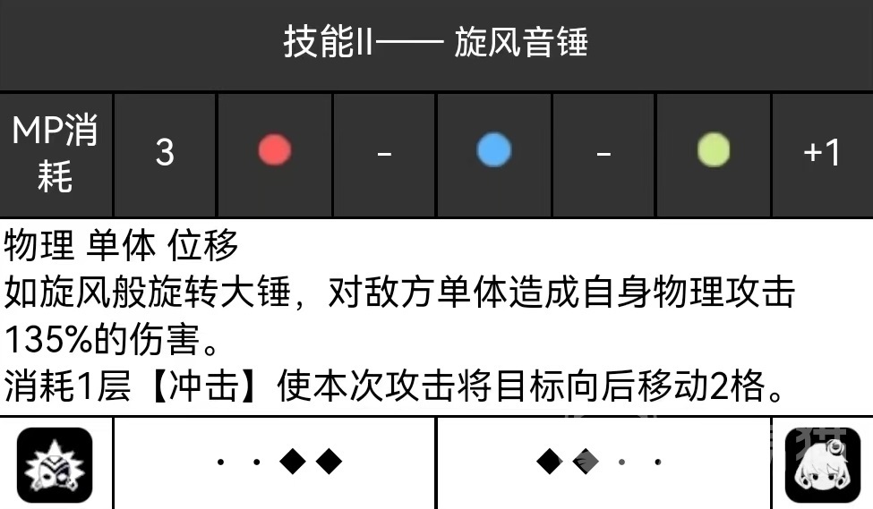 第2个技能旋风音锤,将手中大锤旋风般旋转起来,伤害选中的敌方单体目标,还会消耗一层冲击状态,使得本次攻击附加击退状态,将目标向后强制移动两格,在游戏中带有强制位移的技能并不多,所以也是该角色主要特点。第3个技能,蹦跳音锤,拿着大锤蹦跳前进,伤害敌方单体目标。需要消耗两层冲击使本次攻击处于必定暴击状态,虽然从伤害比例来看只有15%,但加上必定暴击,输出就变得非常可观。