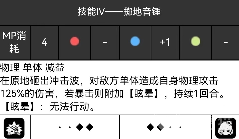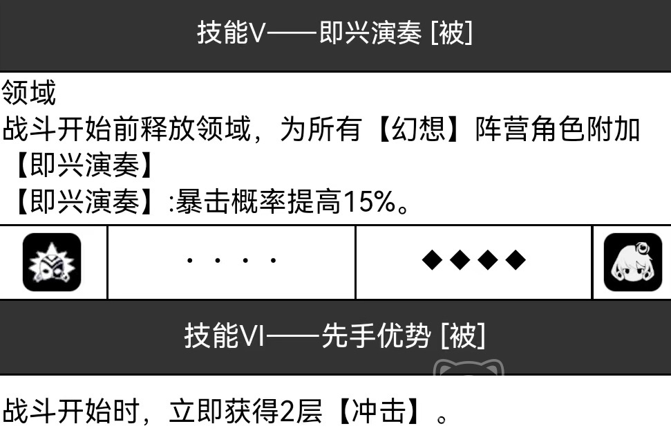 第4个技能掷地音锤,在原地砸出冲击波,伤害敌方单体目标,如果触发暴击则附加眩晕状态,持续一回合,眩晕之后敌方就无法行动,是非常有效的控制状态。另外还具有两个被动效果,第1个即兴演奏,战斗开始时释放出领域,己方所有幻想阵营里的角色,都将附加演奏状态,提高15%暴击率。第2个被动是先手优势,战斗开始时立即获得两重冲击状态,有效提升了战斗初期输出能力以及技能使用时的附加状态触发。