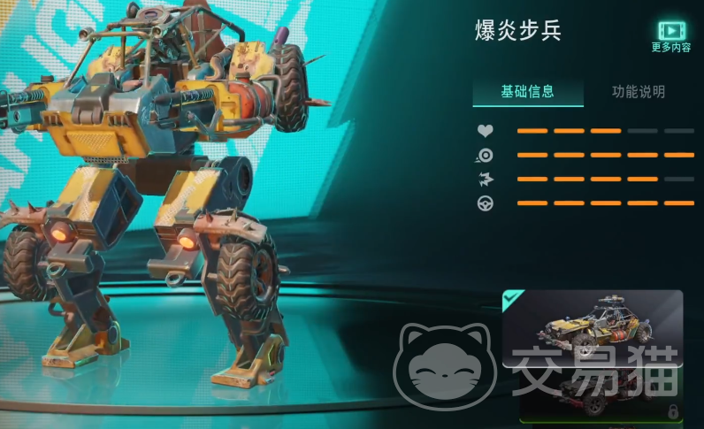 接下来这个载具就是爆炎步兵,因为角色可以像变形金刚一样在战车和甲形态中来回切换,所以很多玩家都比较喜欢操控这个载具,战斗的过程中可以使用火枪对敌人进行攻击,而且是攻击能力相对比较强的群体攻击,能够快速击杀战场上的对手。