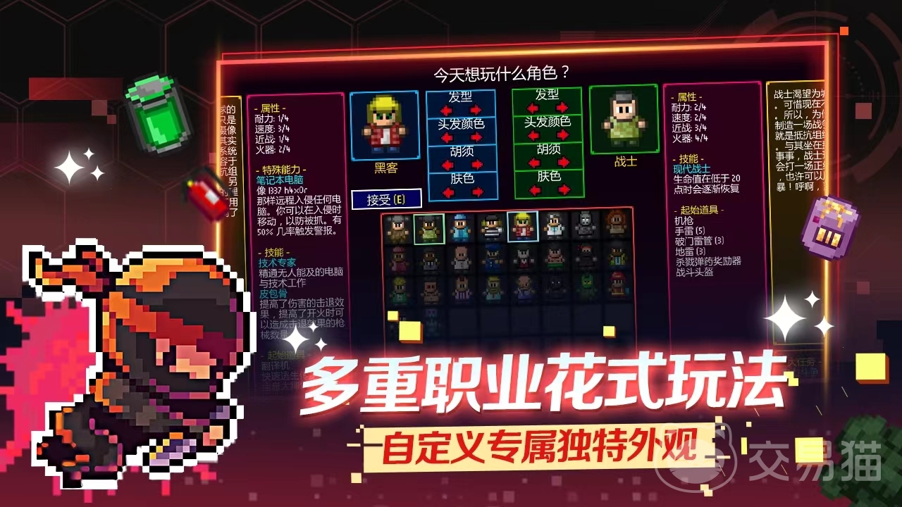 游戏当中也有非常多的职业角色供玩家们挑选,在这里新手玩家的话推荐选择游戏当中的街头小子和士兵,这两个职业角色无论从技能还是从能力上来说都是比较适合新手入手的,其实除了这两个角色以外还有黑客以及医生等等这些其他的角色,角色虽然不同但是他们都只有一个目标,那就是帮助玩家们更好的完成游戏所布置的任务。