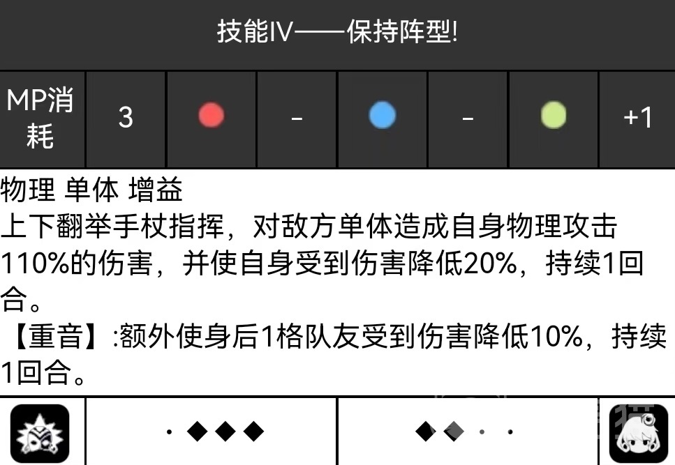 第4个技能保持阵型。举起手中的手杖进行指挥,伤害敌方单体目标,并使自身受到伤害降低持续一回合。在重音状态下,额外使身后一格队友受到伤害也降低10%,同样持续一回合。另外在每场战斗中,当血量低于40%,立即获得一次血量恢复,每场战斗只能生效一次,相当于提升了生存能力。另外还有一个被动,战斗开始时,所有技能默认进入重音状态,这样就能很好地触发额外效果。