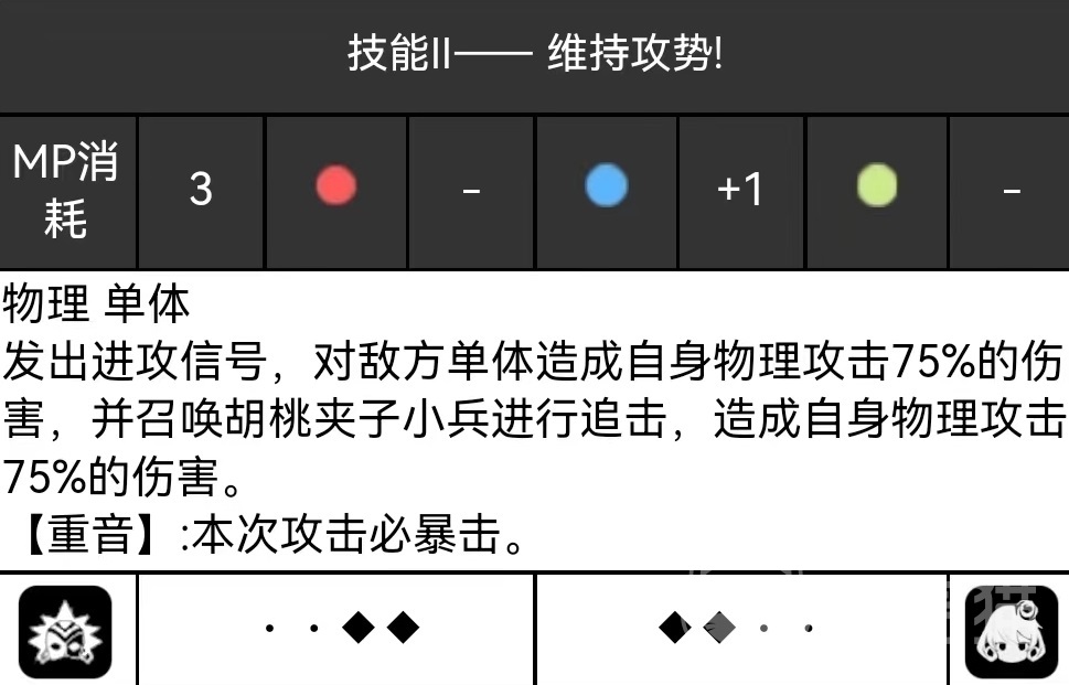 第2个技能维持攻势,发出进攻信号,对单体敌方目标造成伤害,召唤出胡桃夹子小兵对敌人进行追击,再造成一次同等数值物理伤害。在重音状态下本次攻击必定触发暴击,这样一来伤害就变得比较可观。需要消耗3点MP,增加一点蓝色音律。技能,鼓舞士气。跃起后砸下手杖,伤害敌方单体目标,攻击之后队伍中所有幻想和欢愉这两个阵营的角色攻击力提升10%,持续两个回合,在重音状态下造成伤害能提高到130%。