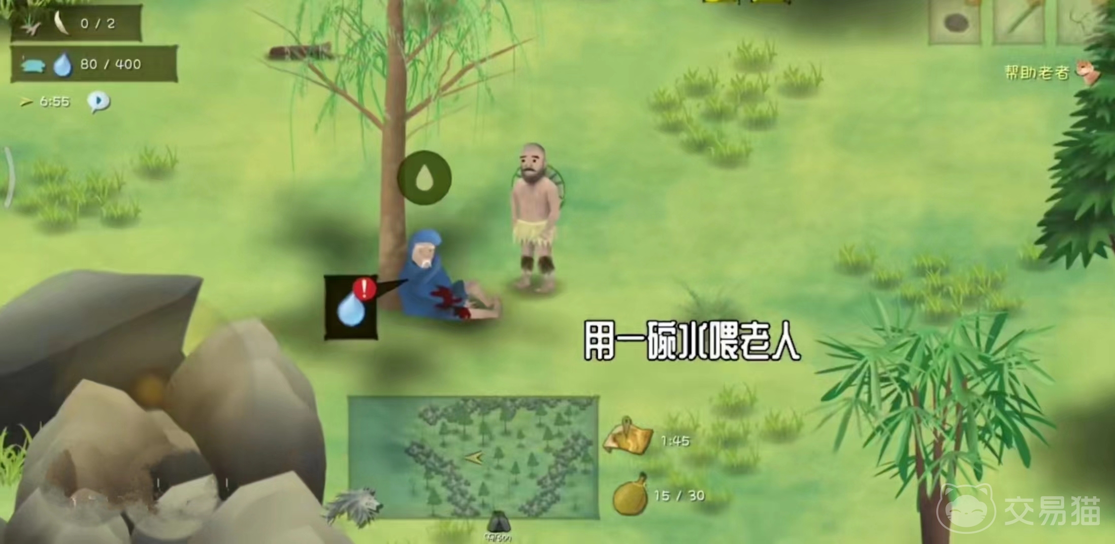 到了中期的时候,玩家已经可以不用为自己的生存进行担忧,所以就可以开始完成一些隐藏的任务,第一个是要接受老者的求助,但这个前提是玩家先要去找到老人的位置,大概在地图北部的一个圈圈里,去找这个老人的时候,记得一定要带着一竹筒水,给老人喝完以后就可以去找他的狗了。