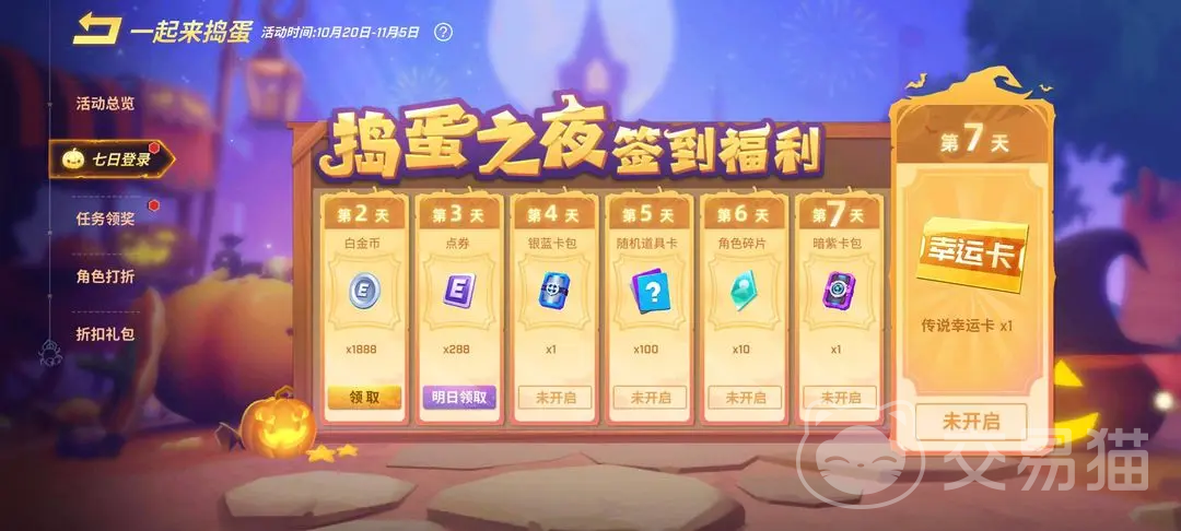 本次的活动是从10月20号正式开启的,首先是一个七日登录的活动,在本月的20号到下月的5号之间大家登录游戏完成签到的话,就能够领取与之相对应的奖励了,而且连续签到七天的话还能够得到传说幸运卡。