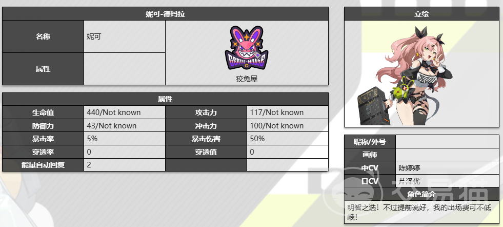 总之,妮可是一个远程输出和牵引的功能型人物,她可以用双枪和能量炮对敌人造成大量的伤害,同时也可以用能量场将敌人聚集在一起,方便队友配合。妮可的闪避技能也让她有很好的移动性和反击能力,她可以灵活地调整位置和上弹。妮可的天赋可以进一步增强她的能量场效果和穿透效果,让她对高防御敌人也有不错的伤害。妮可是一个非常有趣和强力的角色,如果你喜欢使用双枪和能量炮的角色,那么妮可一定会让你玩得很开心。