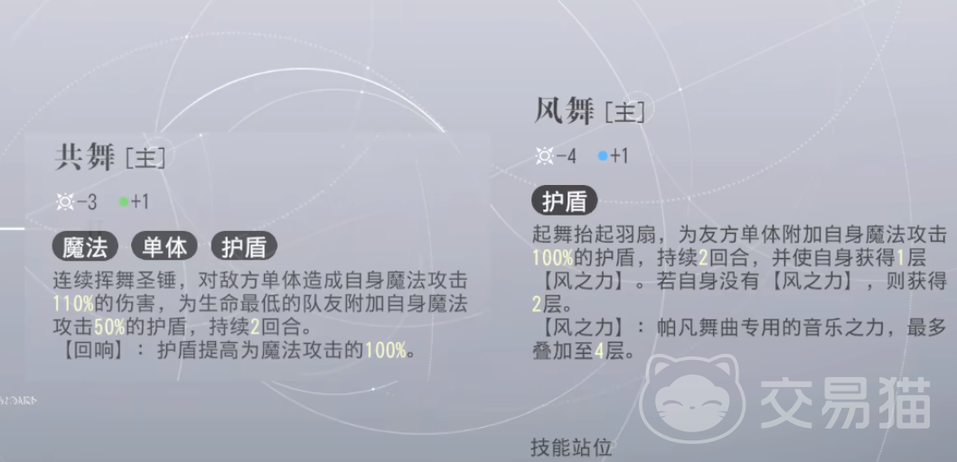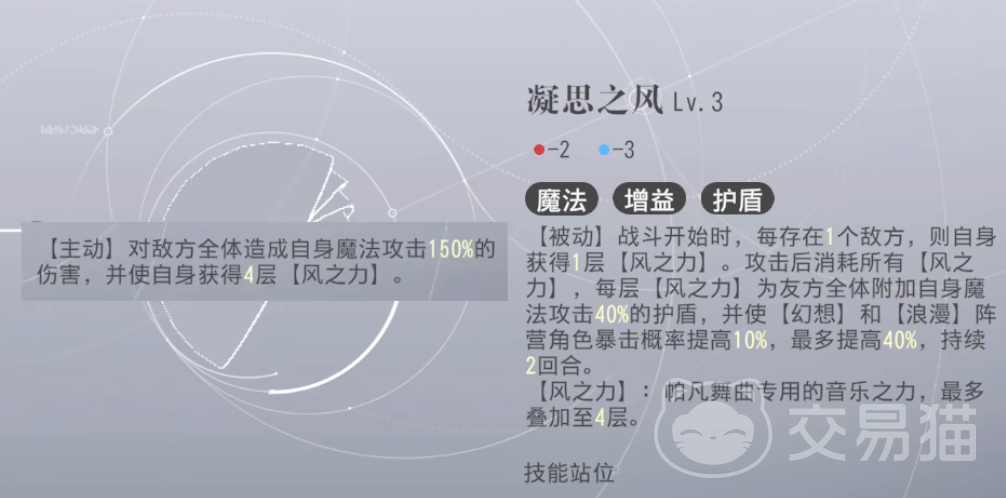 被动是她群体护盾的来源,最高4层,也就是自己魔攻160%的倍率,相当惊人。大招群伤并叠满被动,除开1技能外其他的所有伤害技能都会直接消耗掉所有的风之力来挂盾,不论有几层被动。