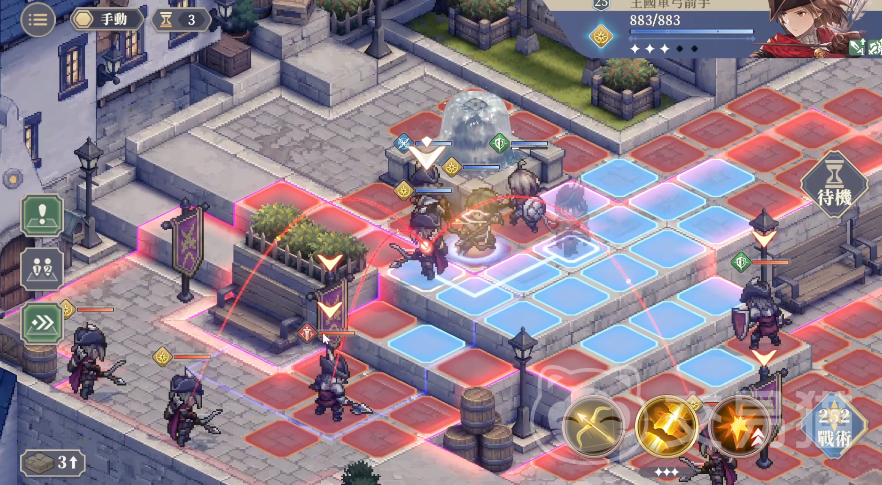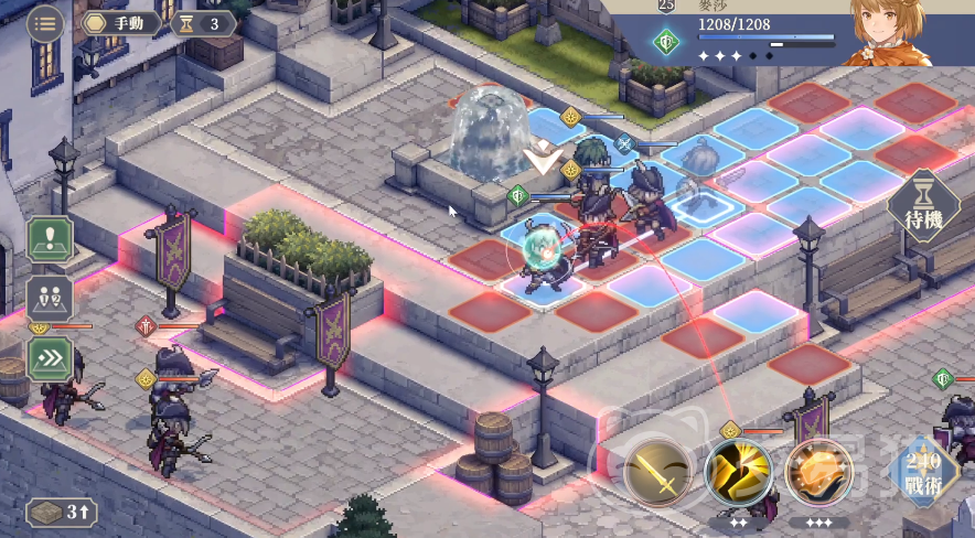 实战中可以先让身板较硬的歌洛莉亚到左翼以此吸收敌人的第一波火力,吸收完之后就可以把麦莎移动过来利用弓手的射程优势去攻击左边和下面的敌人,麦莎打完之后还可以让法卡尔也跟过来继续补充远程火力。