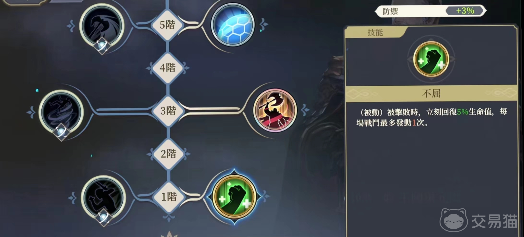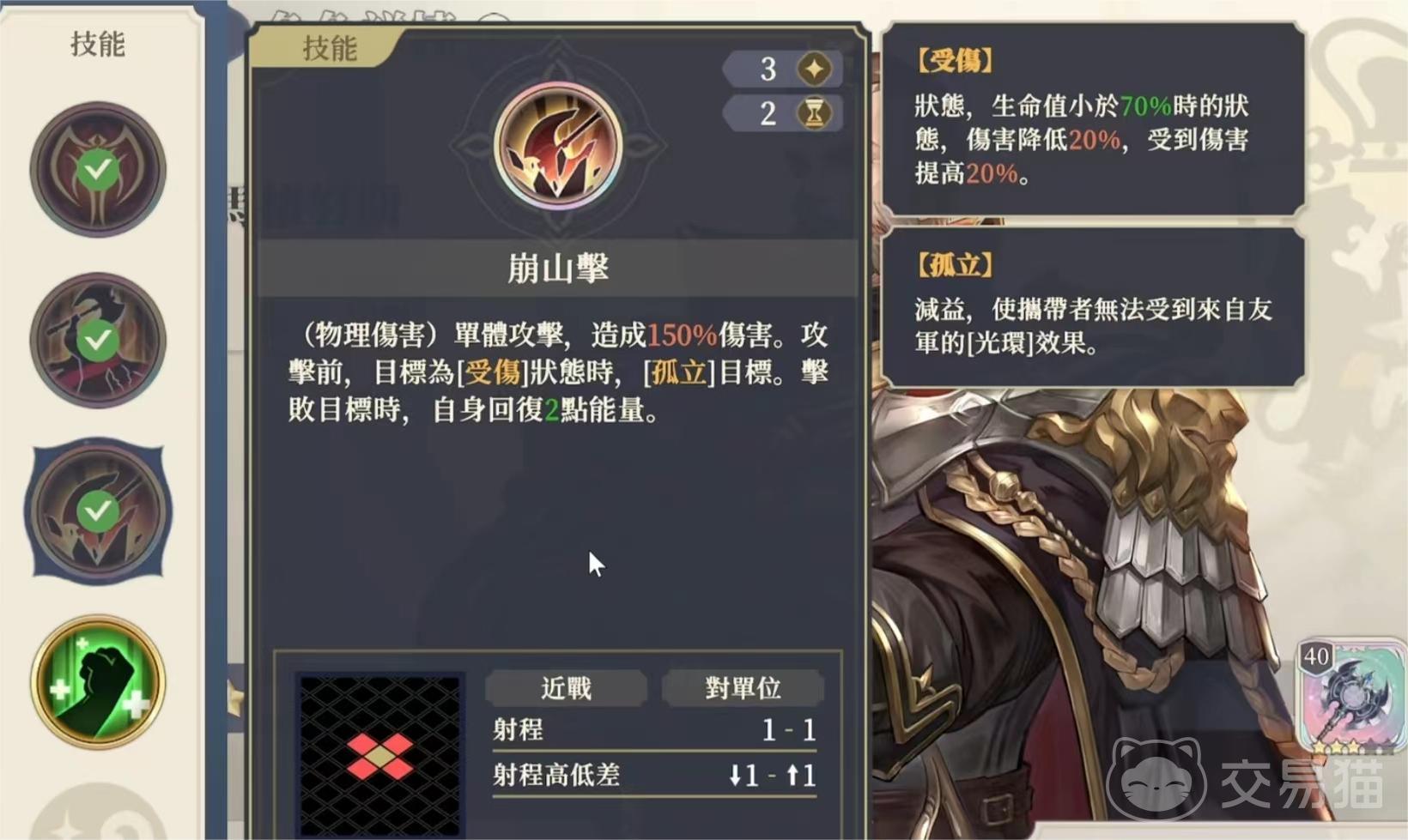 还有一个单体攻击技能是崩山击,他使用这个技能,那么能够对敌人造成的伤害达到了150%,并且如果将敌人给击败了,还可以让自身的能量回复,还有一个反击技能是硬化,如果玩家正处在被敌人攻击的时候,那么使用这个技能的话,就能够将所受到的攻击伤害给降低,并且同时还能获得免伤效果,所以一般来说可以把这名角色放在前排去为队友承伤害。