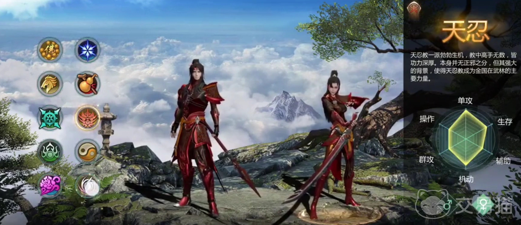 目前,天忍分为内功为主的魔天忍和外功为主的战天忍。魔天忍是游戏当中一个非常不错的远程输出性职业,拥有着游戏当中最强的火系灼烧技能,在远程输出方面来看,持续性输出能力极为优秀。而战天忍作为近战系职业,以力量为主,搭配上近身作战的高突进以及伤害百分比回血的吸血效果,只要自己装备强度够,那么基本上无论来多少人都可以屹立大地之上。