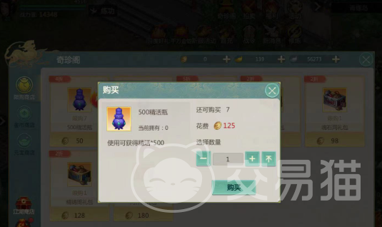 剑侠世界起源当前提供给小伙伴们去获取精活的渠道有三个,第一种是最简单的,不需要小伙伴们去做任务,直接点开珍宝阁就可以在里面去购买精活,不过每个玩家每天都有一定的购买次数,并且也只有一些月卡玩家是可以享受四折价格去购买的。