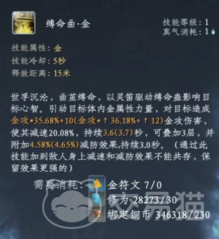 缚命曲·金,单体目标金攻伤害并减速敌人,能叠3层,同时还会附加减防效果。