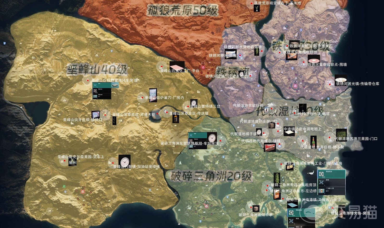 【8】代顿湿地的腐烂庄园。【9】铁锈河波光镇的传送带那里。【10】中途镇边上的变电端。【11】电初石溪的化工厂。【12】平杉野营地风车房。【13】熔炉巢穴那里的厂房。【14】鞍镇加油站旁的楼梯。【15】斯克尔森果园的货车。【16】牙巨楔的楼梯旁。【17】深草旅店的河道木桩。【18】还有霍特镇的三岔塔。