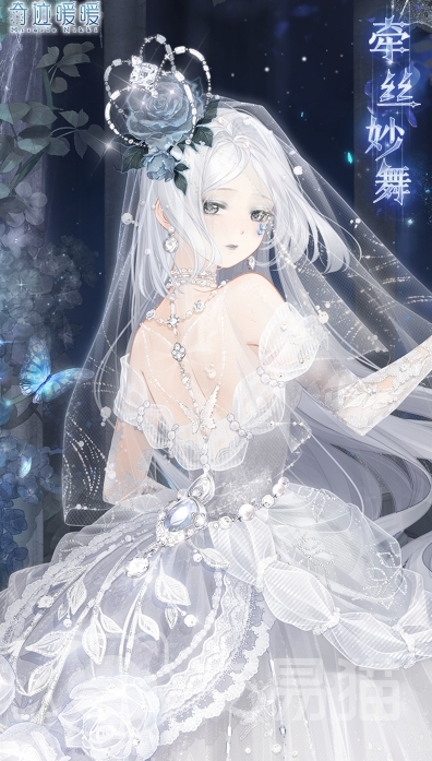 裙子部分整体的颜色是白色,其中的鎏光装饰让角色看起来更加的高贵,上身之后看得出来是一件礼服裙,做成大摆类似花嫁婚纱的款式,还有蓝色花朵的点缀,头上的大花头纱看起来是非常吸引眼球的存在,在整体的制作上面其实就安排了两种颜色互相配合。