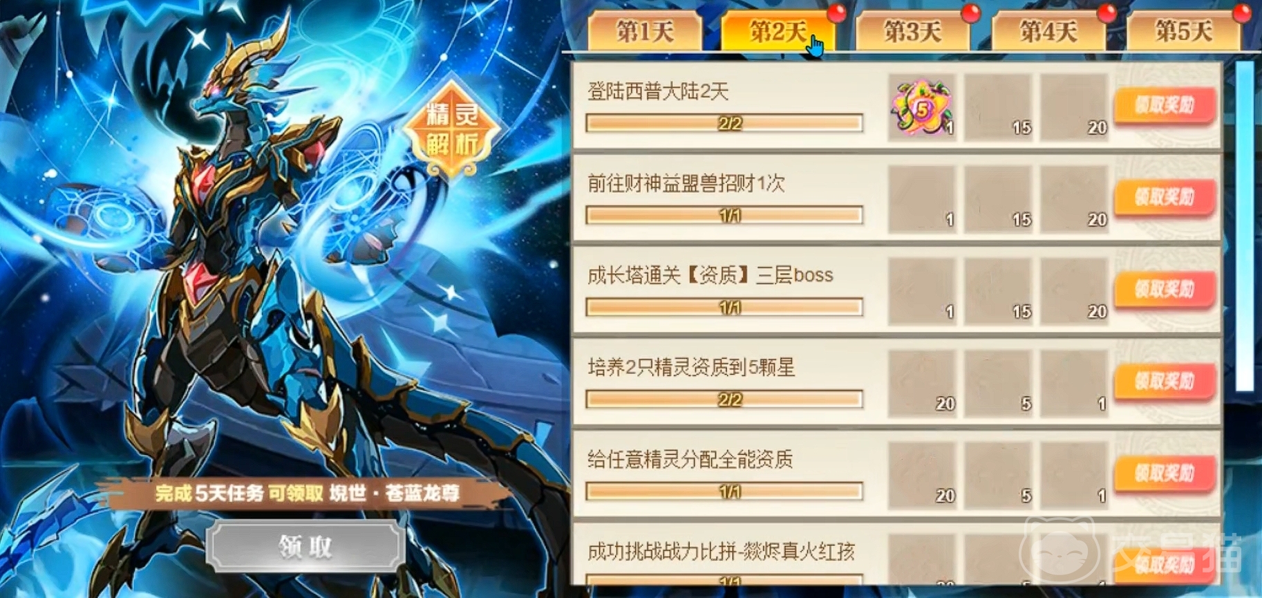 当然,更关键的是,他现在是全民登录就送,在PC上完成五天任务即可以领取蓝龙王作为自己今后的主力精灵选择。获取条件相当轻松,甚至可以说,他是目前整个游戏当中保值时间最长的角色了,对于新手玩家而言,可以让他上场,绝大多数的关卡,甚至后期还有个武魂觉醒,还能再战两年半。