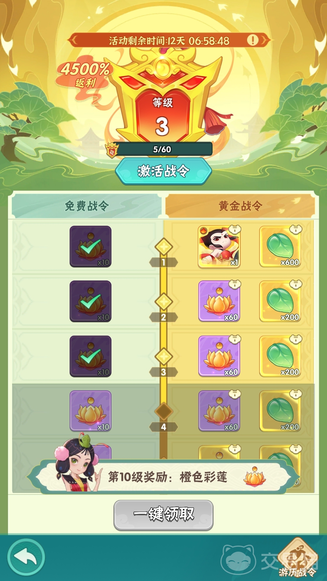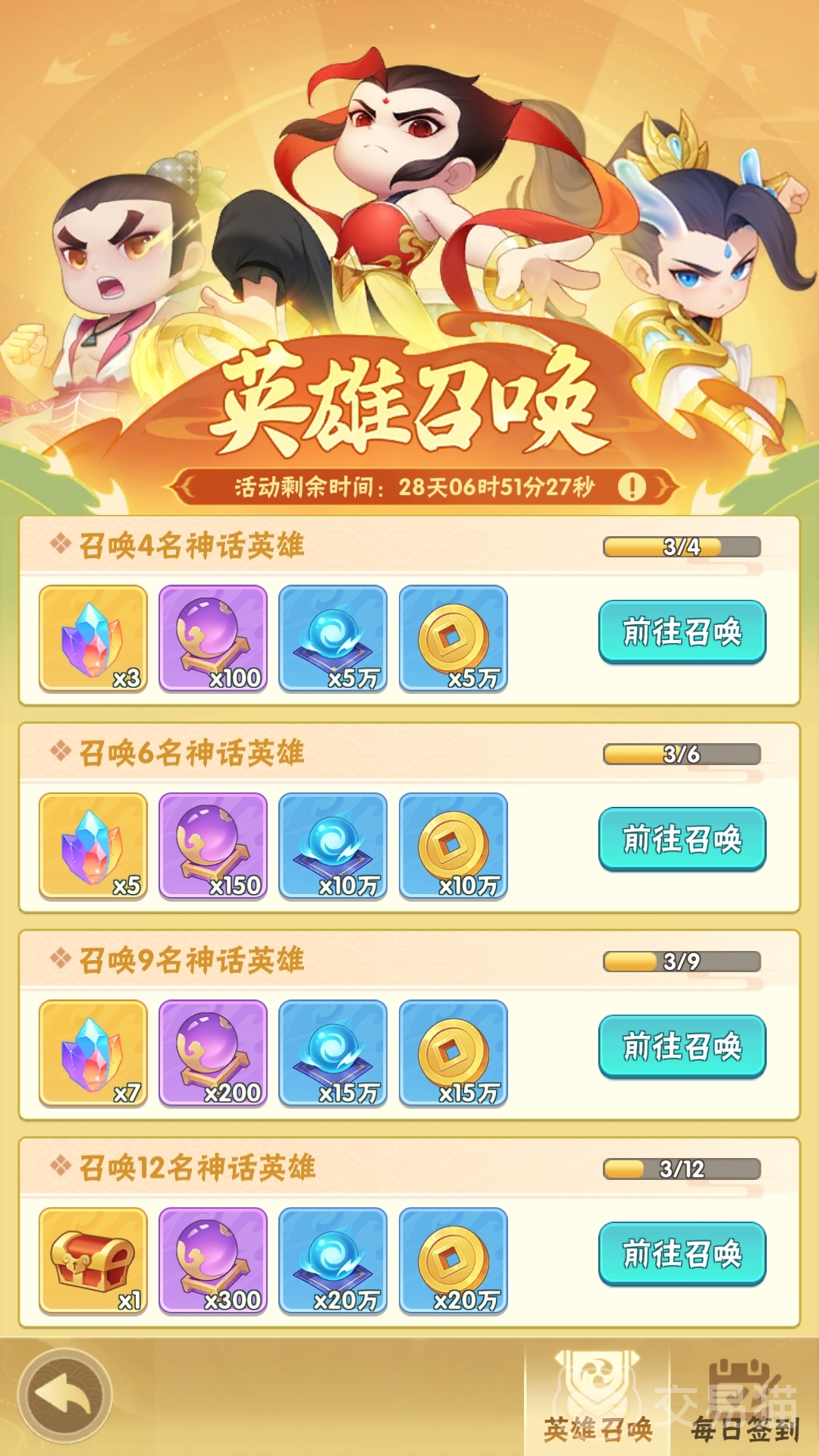 除了两大“七日”福利内容外,葫芦娃大作战还有按月计算的每日签到活动,以及战令奖励。前者每位玩家每天通过签到就能获取奖励,而后者则需要完成各类任务目标来累积战令经验,才能逐步领取每一战令等级的奖励。此外,玩家若是招募到的神话英雄(五星角色)足够多,还可在达成相应目标后在英雄召唤界面领取更多的福利作为奖励。