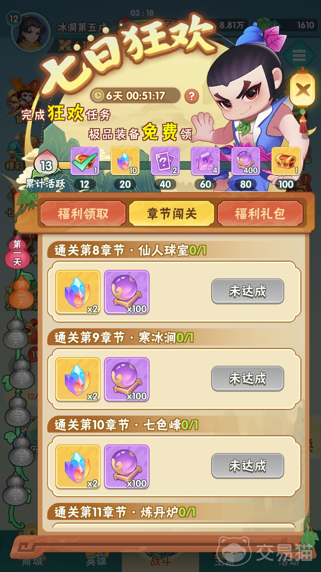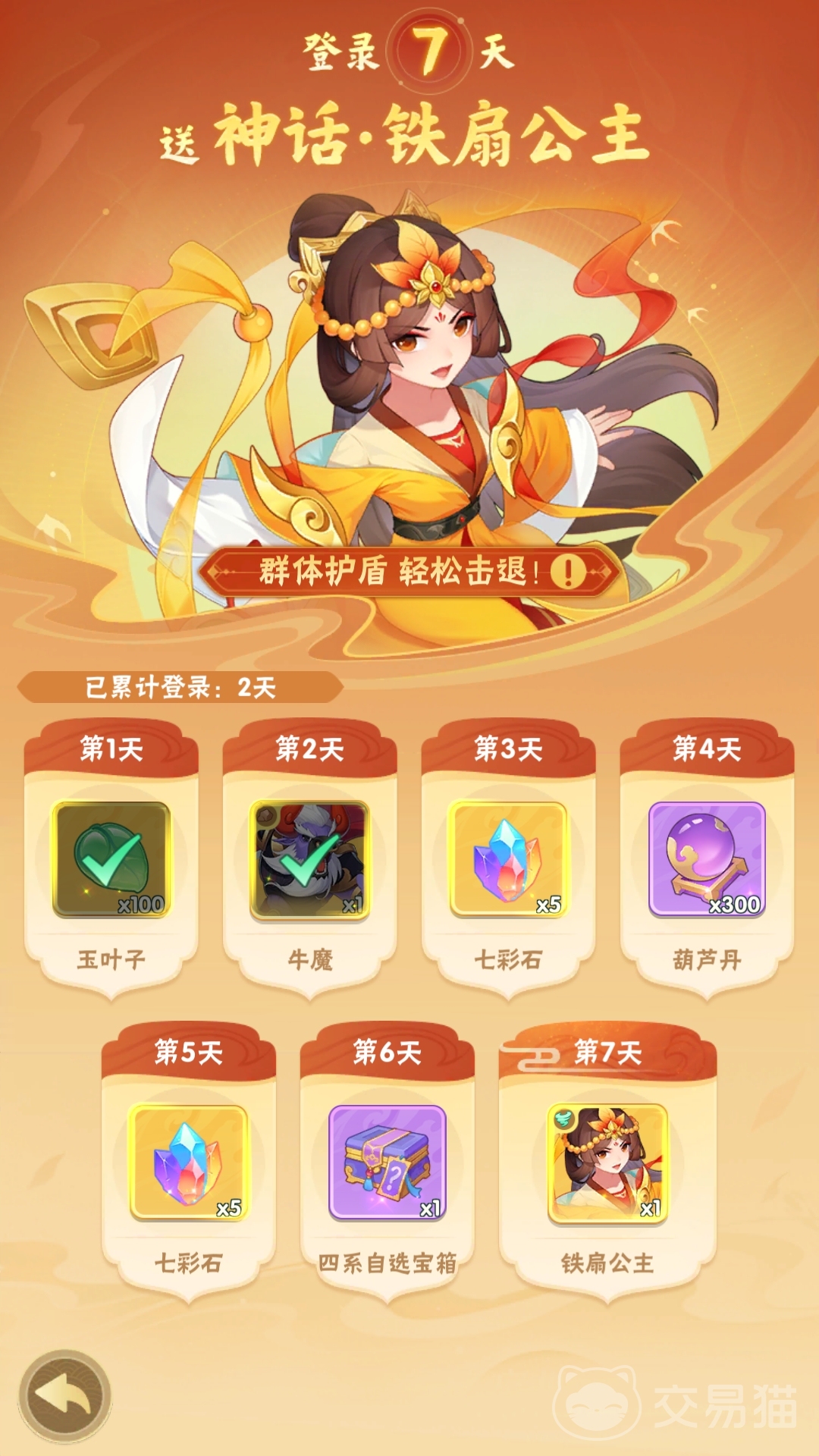 初入游戏的玩家会直接根据游戏的引导看到两大“七日”福利内容,分别为七日登录和七日狂欢。其中,七日登录只需玩家每天进行一次登录,就会送五星英雄牛魔(第二天)和铁扇公主(第七天)给玩家,此外还有一些抽卡用的道具和养成资源。