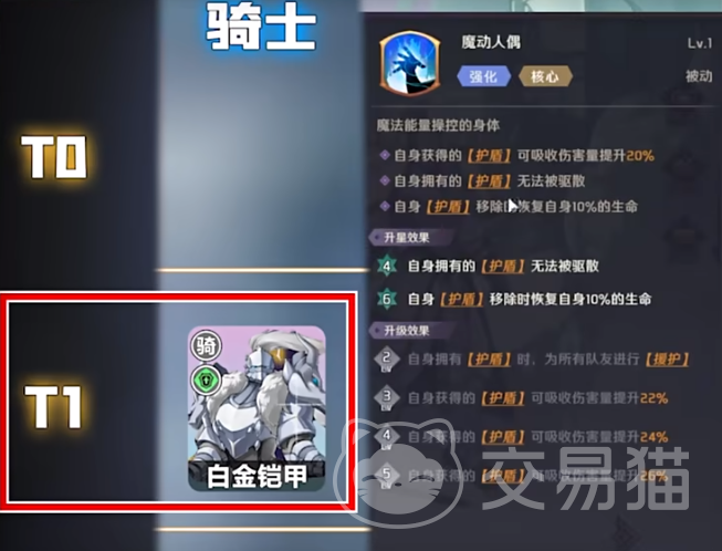 白金铠甲属于骑士,防御力较高,所使用的护盾可以吸收伤害,护盾一旦消失,还能回血,进行团队战时,护盾可以援护队友,只要敌人没有将护盾攻破,那么队友安全性就会得到提高。如果敌方有角色可以无视骑士防御,那么玩家需要做好其它的防御。