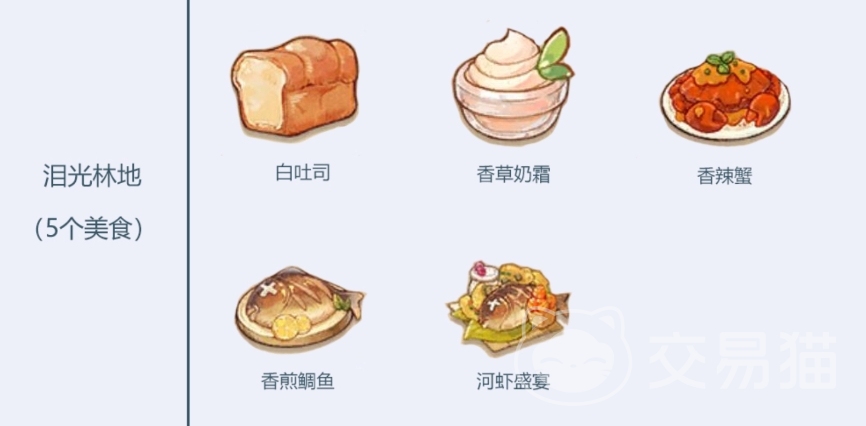 在泪光营地上有盛产的食材和限定食材,其中泪光营地中有很多河流,所以在食物上有很多鱼、虾、蟹等,这些需要玩家们在河边进行垂钓获得。乐光营地上一共能制作出这5道美味,分别制作并消耗后就能完成这项成就了。