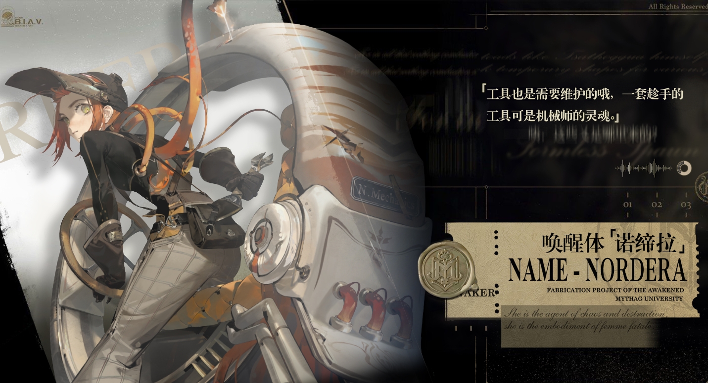 别称鹦鹉螺,是混沌界域当中ssr稀有度的角色,玩家们可以通过唤醒或者角色活动唤醒获得。作为机械师来说,她是合格的,让人最印象深刻的莫过于鹦鹉螺外壳造型的机车,以及其卓越的机械技艺。随身携带着工具,来保证自己可以随时随地进行机械维护。正如她所说,工具也是需要维护的,一套趁手的工具可是机器师的灵魂。