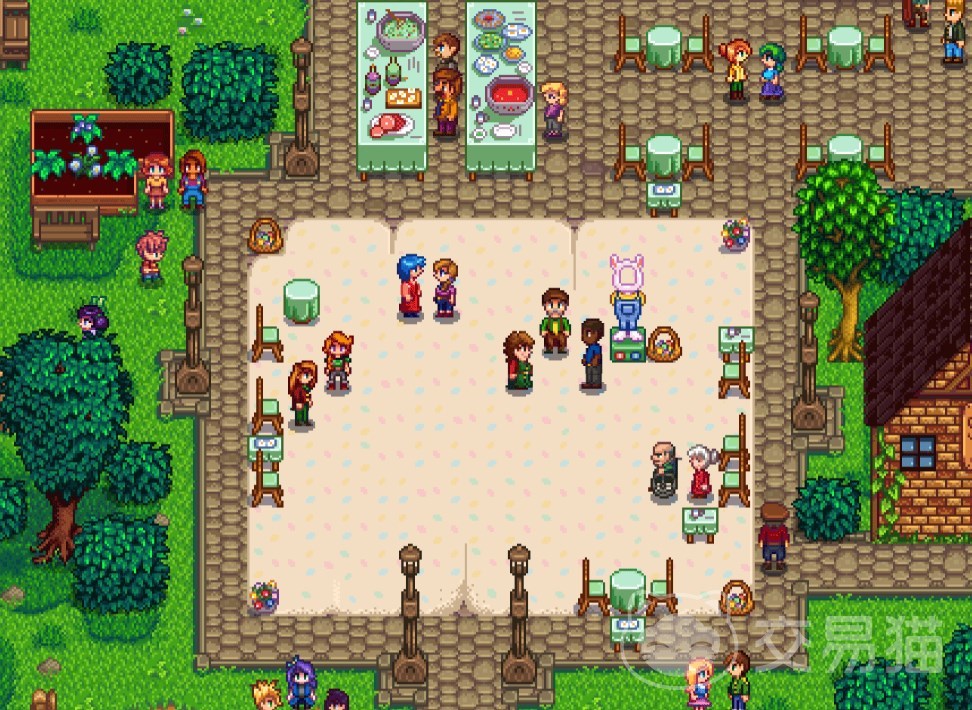 会有很多村民聚集在这里,可以与之对话。在和市长对话后则进入该活动的第二部分,后一部分完成这一天就结束了,也就无法和其他人对话交换物品了,因此最好是先把能完成的都完成了,比如说去皮埃尔那里买绒毛兔子、草莓种子,然后再去做第二个活动。不过无法卖东西给皮埃尔。如果你发现这个NPC被箱子围起来了,无法交谈,只要绕到该商店的后方就可以和他对话了。