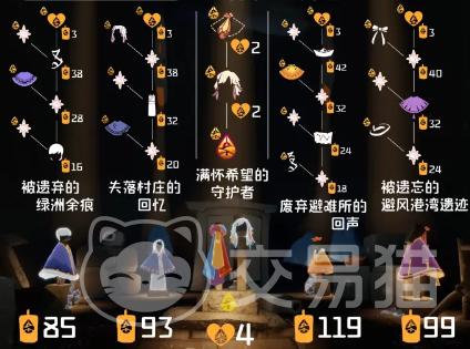 在归巢季中一共有四位先祖,你可以在不同的先祖中兑换不同的物品,而且需要花费的季节蜡烛也是不同的,最便宜的需要85个季节蜡烛,而最贵的则需要119个季节蜡烛,资源不够多的朋友可以精挑细选,不过有着大量季节蜡烛的朋友,则可以全部兑换掉,让自己一次收集个爽!