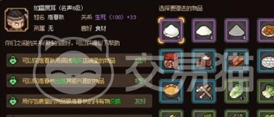 这时候可以和他进行对话,然后选择给他赠送食物,赠送食物给他的话是可以提高他对大家的好感度的,食物的话目前没有什么限定的,随便什么食物都是可行的;一直刷跟他的好感度,好感度达到59点的时候,就能够将侠客的支线任务触发了,就是上文说的帮助庖春秋寻找菜刀了。
