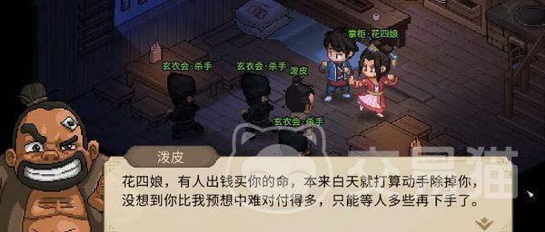 它是玄衣会的一个刺杀任务,需要大家在游戏中将泼皮无赖以及三个黑衣人击败,完成该任务之后就可以将四娘加入队伍了,并且还可以获得蓝色品质的拳法,花拳绣腿以及花四娘的宝箱钥匙,让四娘在队伍中获得一个专属天赋私家小厨。