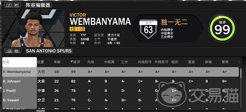 在常规模式中,nba2k23的球员名单是按照现实中的真实名单来的,也就是同步的,甚至在一些交易完成之后,游戏中也会更新名单。文班亚马目前就是圣安东尼奥马刺队的一员。