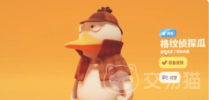鸭子名叫阿瓜,阿瓜有着大大的眼睛,外形是一只鸭子,让他的眼神看起来比别的小动物更加的睿智了,喜欢穿一身格纹的服装来cos侦探,也不知道这个服装对于它本身而言是不是有加持呢,它拥有的皮肤也是比较多的,大家可以酌情去选购。