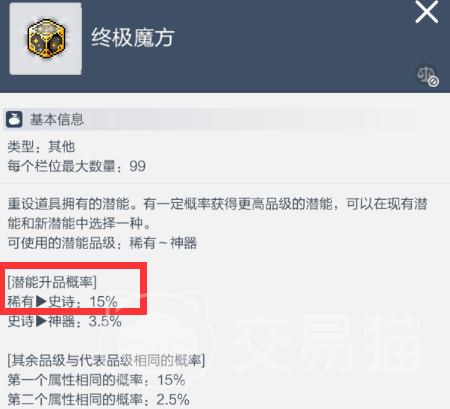 不过话说回来,该潜能想刷出来还是很难的,这个潜能在游戏中的出现几率也就只有3%左右,因此可能刷几百个卷才有可能出一个,而遇到这种情况时大家就可以利用一种叫做魔方的东西去提升潜能的品质了。