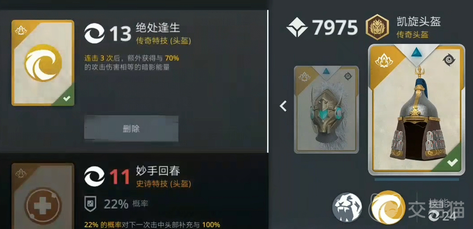 头盔技能方面绝处逢生必须得带,能够有效的帮助大家进行续命。它的效果为在连击三次之后可以获得与自己70%攻击伤害相等的暗影能量,能有效的进行暗影能量的恢复,帮助我们在技能触发之后保证自己生存。