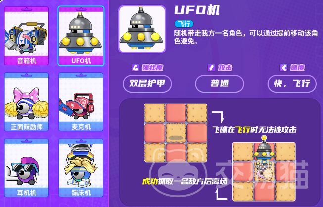 这一关是最后一个关卡了,大家需要面对2个boss机械怪和三个基础的机械怪,基础的机械怪就不做过多介绍了;【音箱机】这个敌人可以对周围的娃娃持续造成伤害,而且拥有剁成护甲,虽然自身的移动速度并不是非常的快,但是基础攻击非常的高!第二个就是【UFO机】,这个boss是悬空的,飞行速度非常的快,来袭的时候会随机拖走棋盘中的一个娃娃!