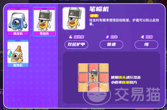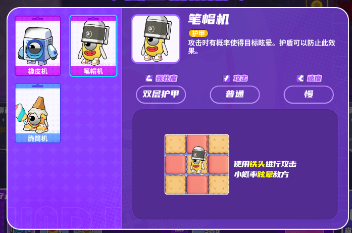 这一关要挑战的机械怪有三个,难度大大提升了,大家如果在这个关卡中没有【底鼓坦克】的话,建议大家先去抽取一下,不然这一关是非常难过的!【橡皮机】的移动速比较慢,但是护甲非常的高;【笔帽机】比较特殊,拥有双层护甲!【脆筒机】是比较基础的攻击机械怪!