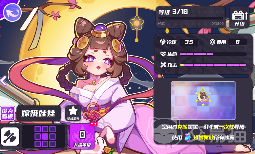 嫦娥娃娃:可别小看了这张紫卡,但是在游戏中的地位可是非常的高的,而且嫦娥娃娃非常适合大家在参加boss战的时候进行使用,自身的技能同样是可以对雾霾中的敌人释放的,而且主动技能【星环】释放技能的时候,可以发射一个星星环绕在自身;奥义技能才是这个职业的强度所在,【月光普照】可以释放出光线,对敌人造成眩晕效果,后续还可以打出大量的星星子弹进行攻击!