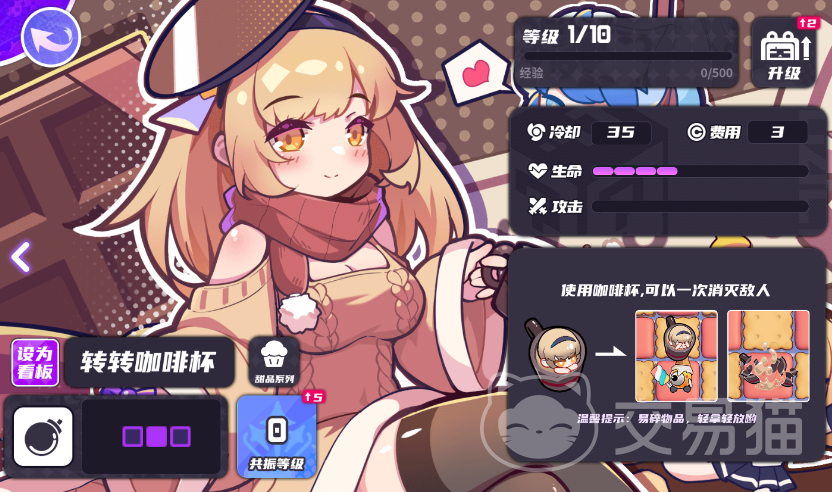 转转咖啡杯:这个职业比较特殊,虽然自身只有一个技能,但是这个技能属于毁灭性的,【破碎坐】可以对竖排的敌人造成攻击,而且可以全部击倒!对于特定的关卡就非常大的用处!