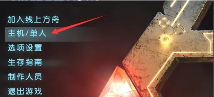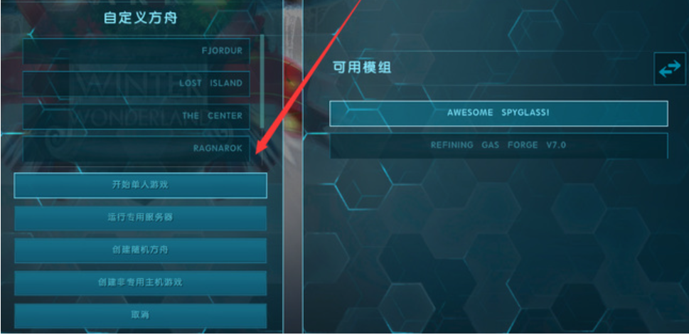 步骤四:由于联机状态下人数过多,为了维护游玩的公平性,所以不能支持在联机状态下插入模组,回到自定义方舟界面点击第一个开始单人游戏就可使模组开始发挥作用啦。