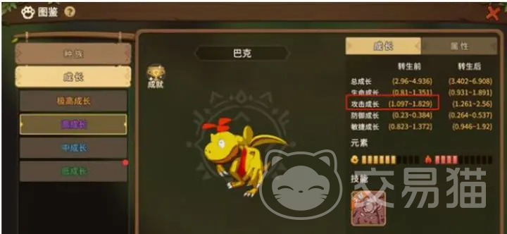巴克是一个成长性非常高的宠物,培养之后给大家带来的收益是非常巨大的,在细心培养,得到成长之后它的攻击力是非常惊人的,甚至它的攻击属性比其他很多稀有的宠物攻击力都高,是不可多得的战斗型的宠物了。而且它的自带天赋是凋零,效果就是可以将对手的治疗效果进行削弱,从而减弱对手的生存能力,是非常好用的减益效果,那么是战斗的不二之选了。所以在游戏前期的时候,非常推荐大家带它进行战斗的,效果明显。